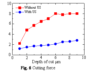 振動ありでは切込量増加に伴う切削抵抗の増加が,振動なしに比べ緩やかである.また,抵抗値も平均して約70%減少している.