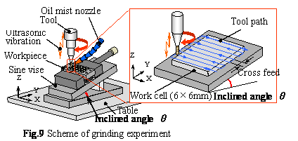 サインバイスを用いて被削材を傾斜させて,3種類(0,10,20°)の傾斜面に対し超音波振動援用加工を行った.